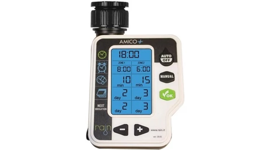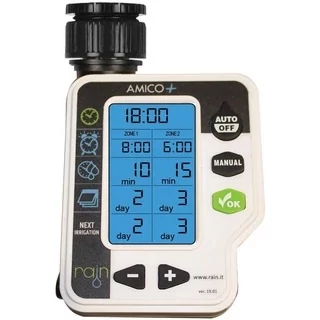A készülék 1 vagy 2 szekciós kivitelben érhető el (AMICO+ és AMICO 2+ modellek), így kisebb és összetettebb kerti öntözési feladatokhoz egyaránt alkalmazható. A kültéri használatra tervezett, strapabíró ABS ház ellenáll az időjárási hatásoknak, míg az elemes működés teljes szabadságot biztosít elektromos csatlakozás nélkül.