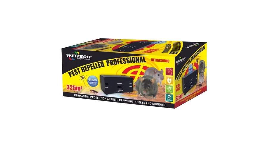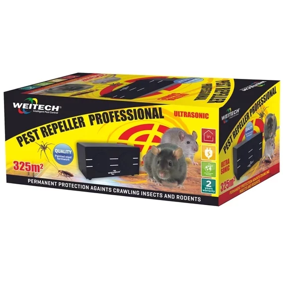 Weitech ultrahangos készülék ajánlott mókus, patkány, egér, pocok, nyest, denevér, valamint rovarok (tücsök, szöcske, kabóca, csótány, pók, darázs, bolha, hangya) elriasztására, akár 350 m2 területen. Készülék fémházzal, két hangszóróval, 3.000-45.000 Hz között bocsát ki ultrahangot, 220V adapterrel működtethető.